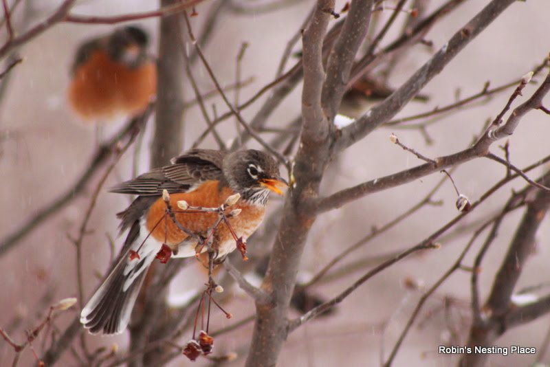 There are so many robins this winter; more than I have ever seen! I don't recall seeing this many at one time, even during spring. I picked up my daughter from work yesterday and the trees were full of robins! It was a frigid day with single digit temperatures and wind chills below zero. The robins were all puffed up trying to keep warm. They look so fat!