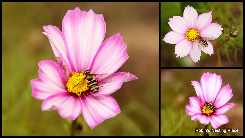I removed most of the cosmos yesterday, the few remaining flowers were attracting the hover flies today. The hover fly looks like a bee and is a very beneficial insect to have in the garden.