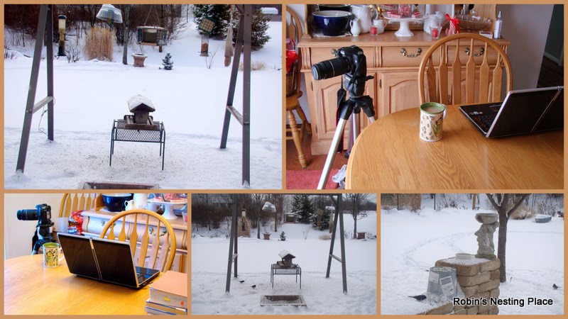 Robin there is no doubt about it that you are commited to your art of photography sitting for hours for the photo opt.with your feathered friends. I suppose that is what I lack the "patience" to sit so long ...I see..run for the camera and by the time it's set ready to shoot my subject has flown away! I have heard that some nature photographers sit in the cold dressed warm w/ blanket and mittens and just wait...no I can't take a chance at getting a cold...I'm not good out in the cold weather..chills me to the bone!!